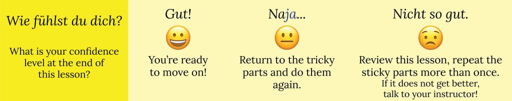 In this lesson, you learned 1) words that point to absolute locations, 2) how to talk about apartment and room floor plans and features more specifically, and 3) words that point to relational locations. Now you have all of the components to talk about the inside of your apartment or room, which will be your Themenprojekt.